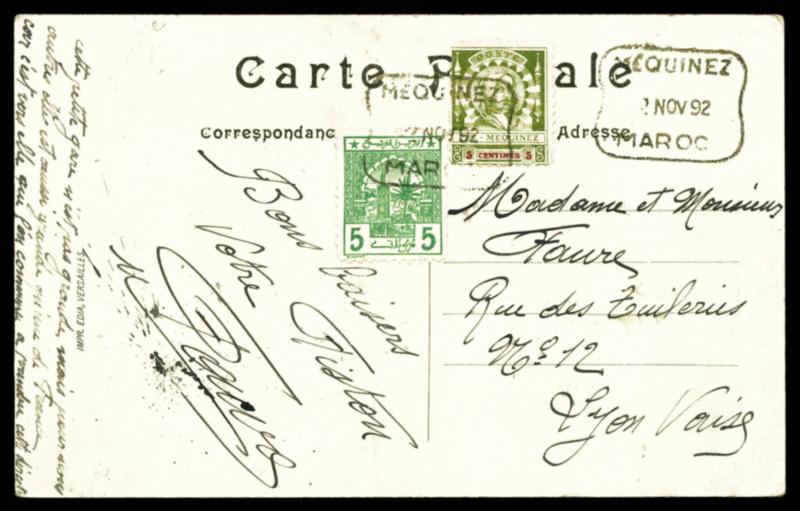 Poste Locale N°16 + Poste Cherifiennes N°3 obl 'MEQUINEZ MAROC sur carte de nov 1892 pour Lyon, très rare comninaison d'affranchissement. TTB Qualité: O (Image)