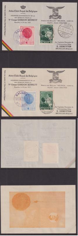 Belgium Balloon Mail 1937 Gordon Bennett Race: Brussels-Riga, Latvia, flown sheet bearing red balloon & E.D cinderella with Riga 26.6.37 arrival cds. Also similar but balloon card (with blue balloon) & E.D cinderella, with orange printed rear featuring balloon & Bennett. 2 Attractive, scarce items. (Image)