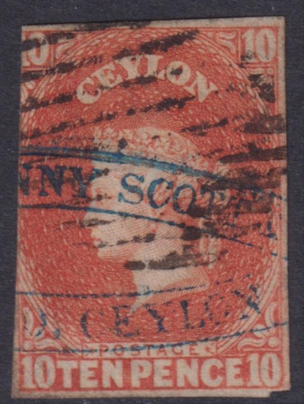 Ceylon 1857 10d QV dull vermilion, white paper, star wmk, almost 3½ margins. SG 9. Cat £325. GU. (Image)