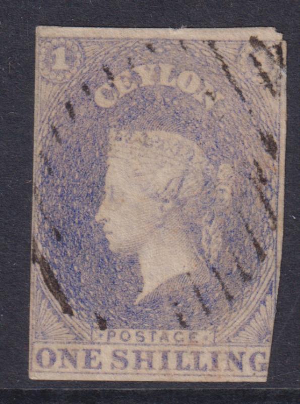 Ceylon 1857 1/- QV slate-violet, white paper, star wmk, imperf 3¾ margins. SG 10. Cat £200. FU. (Image)