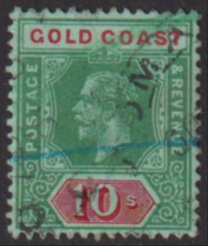 Gold Coast 1916 10/- GV, mult crown CA wmk, with horiz blue regn line. SG 83a. Cat £120. FU. (Image)