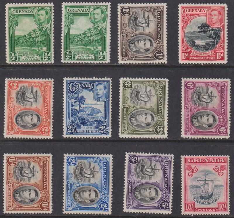 Grenada 1938 ½d to 10/- GVI Pictorials set plus extra ½d shade. SG cat £80+. Mint. (Image)