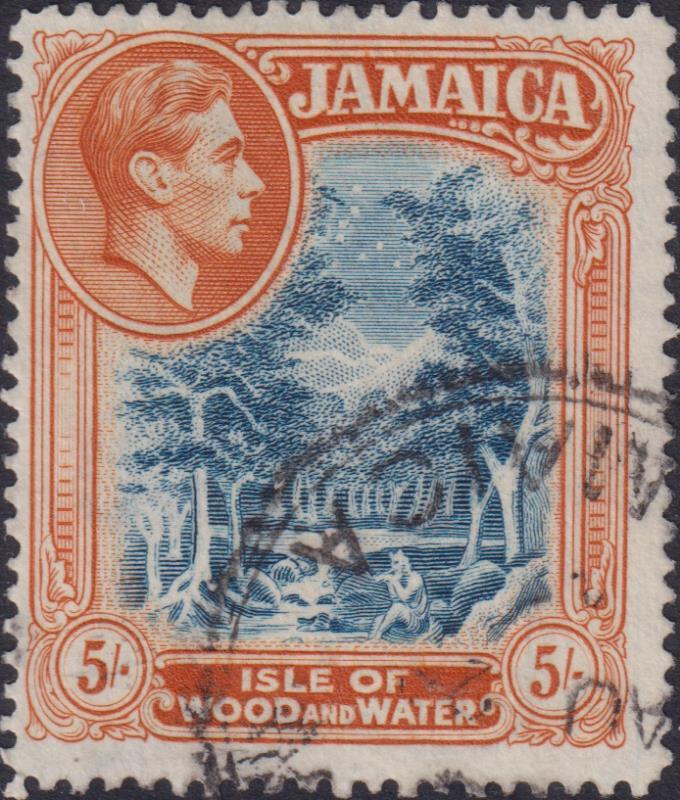 Jamaica 1941 5/- GVI & Forest Scene slate-blue & yellow-orange, line p14. Rare variant. SG 132a. Cat £275. FU. (Image)