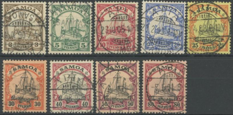 1900, 3 - 80 Pf. Imperial yacht, as well 5 Pf. With postmark SALELAVALU, 9 superb items, mostly expertized (Image)