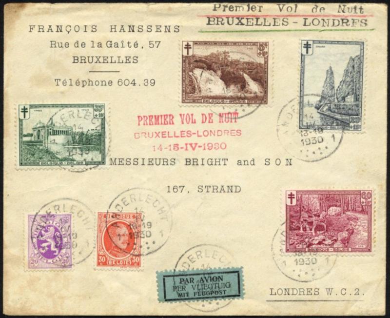 14 / 15.4.30, Night first flight "BRUSSELS LONDON", with 6 stamps franked, letter very fine, Müller 102 (Image)