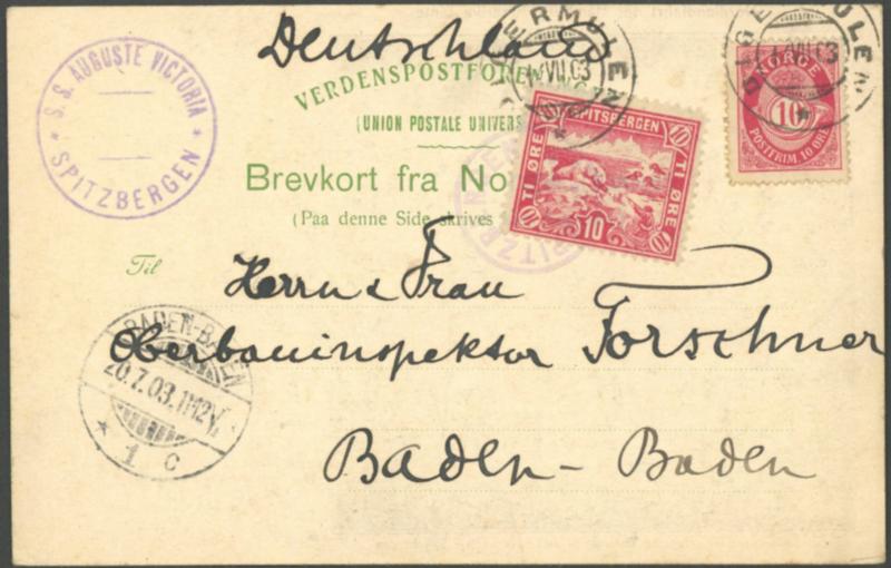 1903 / 05, 10 Ø carmine, 2 various picture postcards from Spitsbergen with 5 and 10 Ø vignettes, 2 superb cards to Germany (Image)