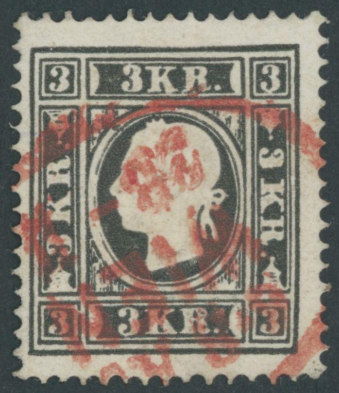 1858, 3 Kr. Black, type II, red cancel, superb, Michel 250.- (Image)