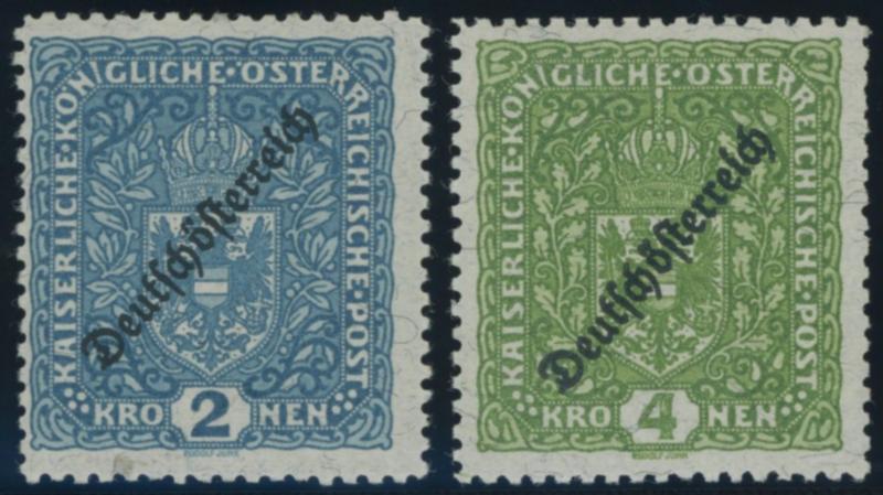 1919, 2 Kr. Prussian-blue and 4 Kr. Dark yellowish green, type II, perforated L 11 ½, rest of hinge, 2 superb items, Michel 145.- (Image)