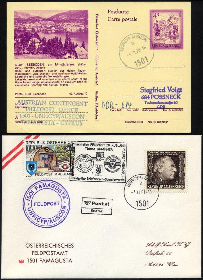 1978 / 81, 2 different documents of the Austrian UN-unit on Cyprus with fieldpost cancel "UNFICYP AUSCON" (a postal stationery postcard and a Memory first day letter), superb (Image)