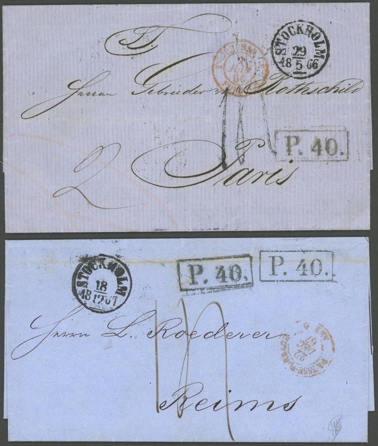 1866 / 7, 2 letters from Stockholm to France with numerous Tax and on route passing cancellations! Very fine / superb (Image)