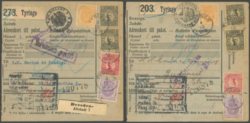 1918, 2 franked package cards from TYRINGE to Hungaria, very fine (Image)