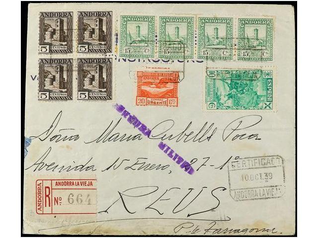 ANDORRA. 1939. ANDORRA a REUS, 5 cts. castaño (4), 15 cts. verde amarillo (4), 20 cts. urgente y sello de Beneficencia de España de 10 cts. verde (RARÍSIMO en una carta procedente de Andorra). Marca de Censura Militar, al dorso llegada. Ed.29 (4), 33 (4), 44. (Image1)