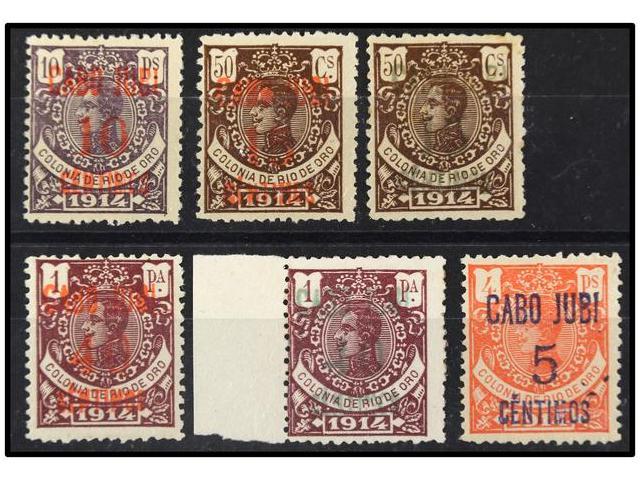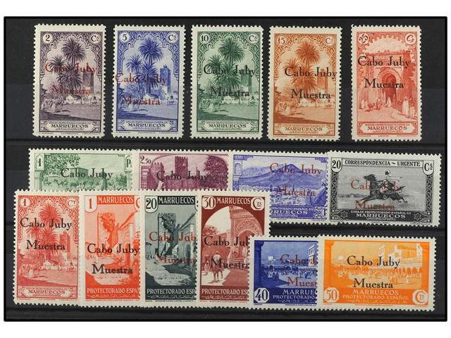 COLONIAS ESPAÑOLAS: CABO JUBY. SERIE completa, centrajes diversos. MUY RARA sin fijasellos. Sello de 5 cts. s. 4 pts. cert. CEM. Ed.1/4A. Cat. 1.065€. (Image1)