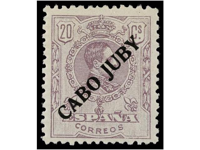 COLONIAS ESPAÑOLAS: CABO JUBY. NO EMITIDO. 20 cts. lila. Centraje perfecto. Sello MUY RARO y más en esta calidad. LUJO. Cert. COMEX. Ed.NE 1. (Image1)