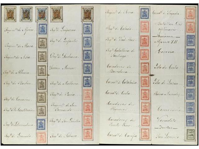 MARRUECOS. 1893 (5 Dic.). DOCUMENTO fechado en MELILLA disponiendo el uso de los sellos de Franquicia de los diversos Cuerpos que estaban de Guarnición en Melilla, a partir del 1 de Enero de 1894. Doble folio con texto en la primera página y con los distintos sellos de Franquicia adheridos para poder ser reconocidos y permitir su circulación. Pieza excepcional y única conocida. PIEZA DE MUSEO. Cert. GRAUS. (Image1)