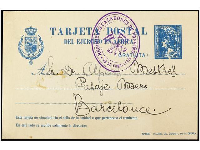 MARRUECOS. 1921. MONTE ARRUIT a BARCELONA. Tarjeta Postal del Ejército de África con franquicia del REGIMIENTO CAZADORES DE TREVIÑO. (Image1)
