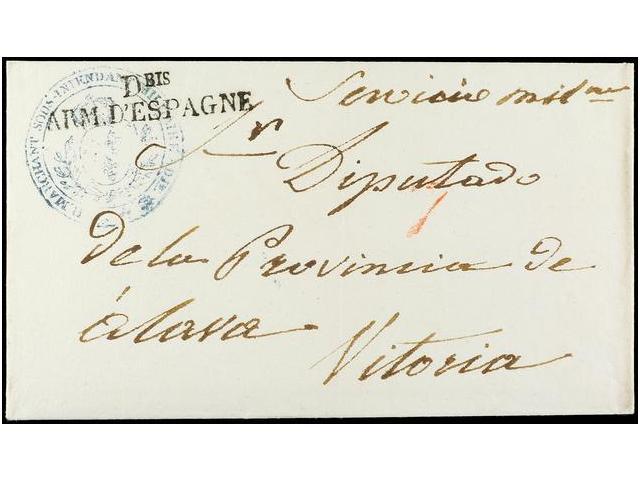 ESPAÑA. (1825 CA.). EJÉRCITOS FRANCESES. Envuelta sin texto de MADRID a VITORIA. Marca de franquicia de La Subintendencia Militar en azul y DBIS/ARM. D´ESPAGNE. PRECIOSA y MUY RARA sobre todo circulada en el interior de la Península. (Image1)