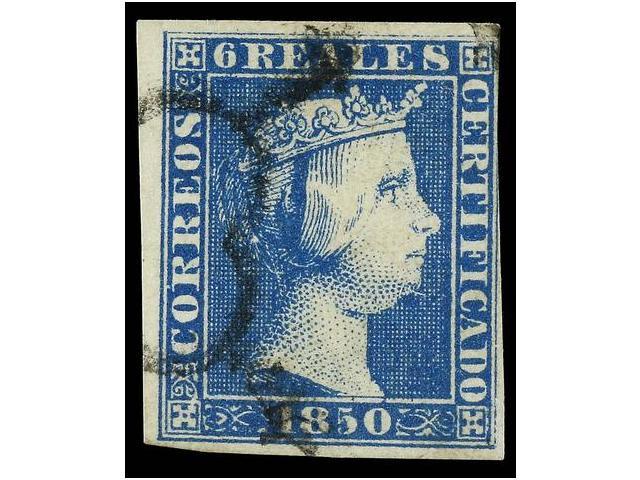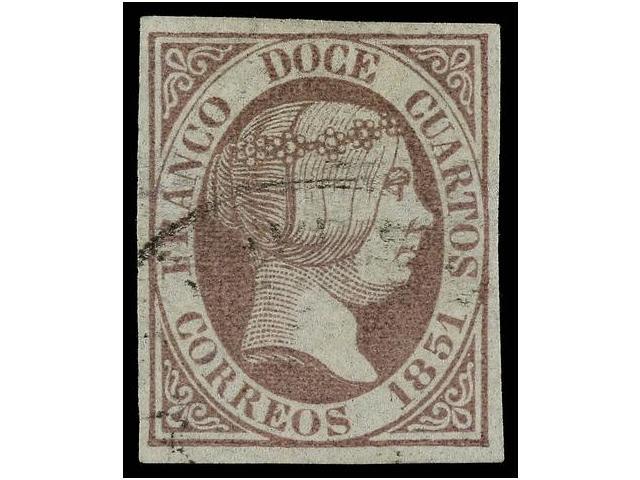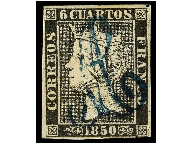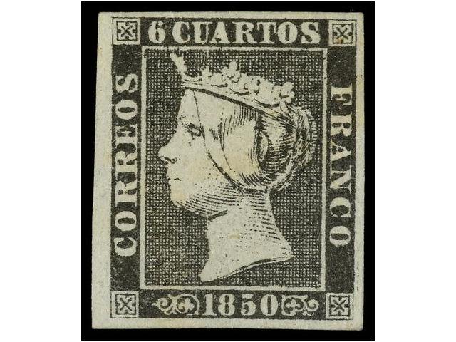 ESPAÑA. 6 cuartos negro, pl. II. Magnífico ejemplar, borde de hoja. LUJO. Cert. GRAUS. Ed.1A. Cat. 610€. (Image1)