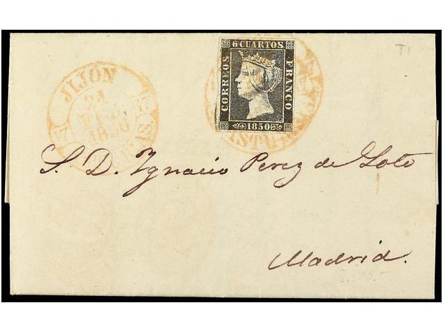 ESPAÑA. 1850. GIJÓN a MADRID. 6 cuartos negro. Mat. fechador JIJÓN / ASTURIAS en negro. MUY BONITA. Ed.1. (Image1)