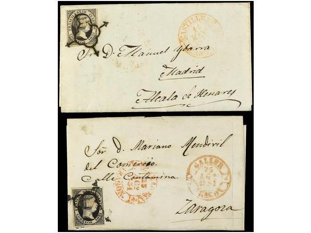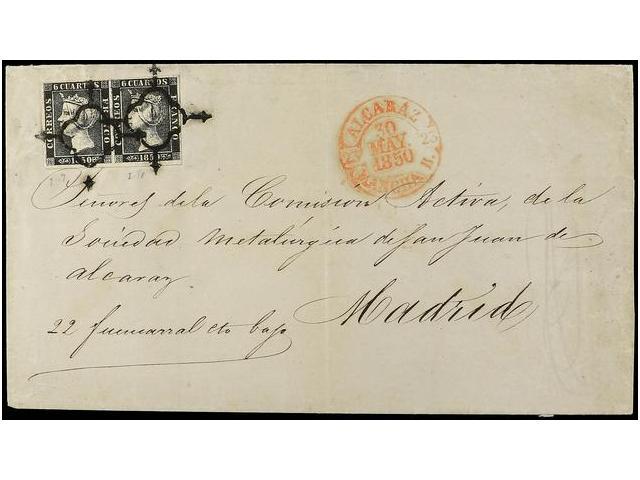 ESPAÑA. 1850. ALCARAZ a MADRID. 6 cuartos negro, pareja. Mat. araña y fechador de ALCARAZ / MANCHA B. Precioso y RARO uso tardío de la plancha I. Ed.1. (Image1)