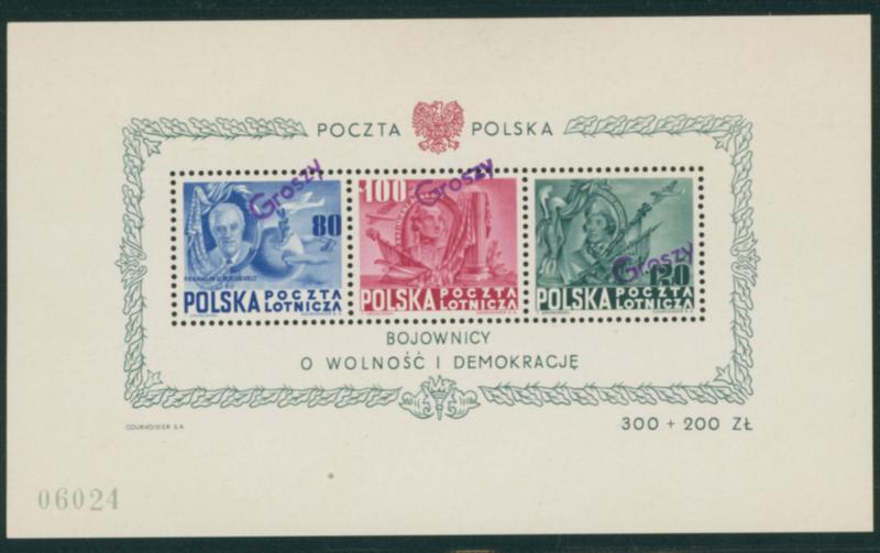 Poland 1948 Roosevelt, Air Post Sheet of 3 handstamped Groszy in violet unused stained, full original gum, (Image1)