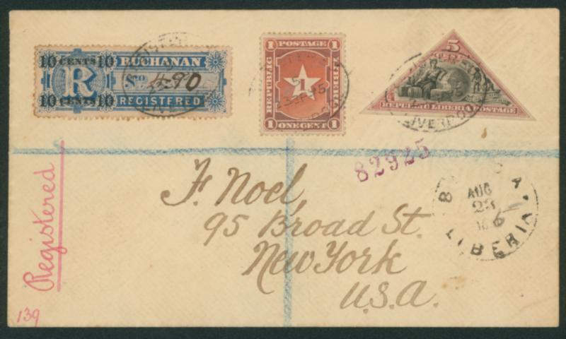 Liberia 1892-1896 1c 5c, 10c Multi-color franking cancelled by datestamp 1895-09-23 to USA transit :LIVERPOOL cover stained, (Image1)