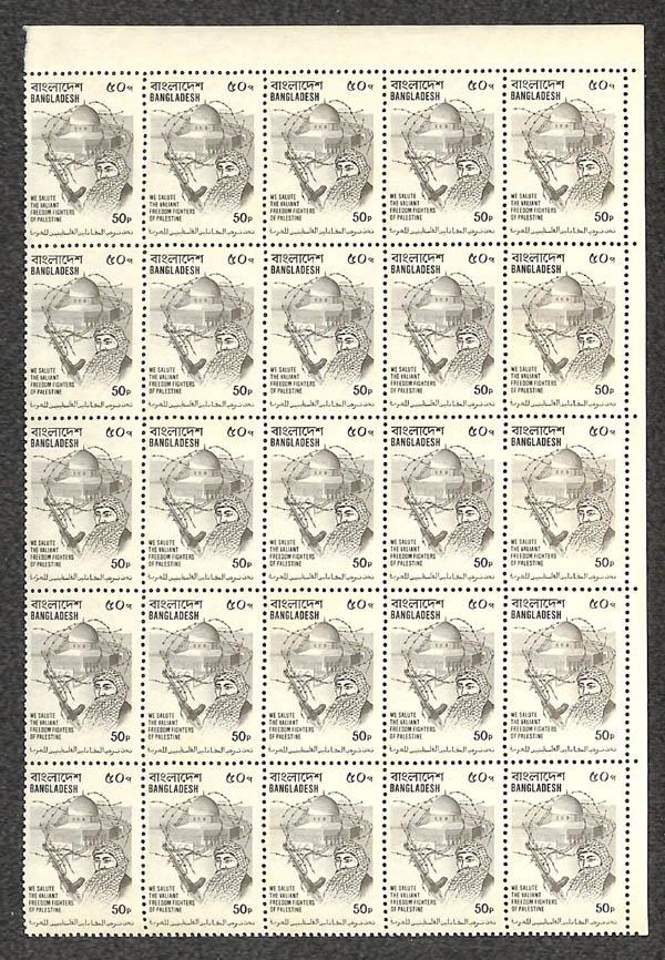 Bangladesh, 1980, Unissued 50p gray Palestinian Welfare, block of 25, never issued due to "Palestinian" and "Freedom" being misspelt in the Arabic inscription at bottom of design; the stamps were withdrawn, but distributed without authorization, o.g., never hinged, Very Fine, with 2016 Calves & Jacquart photo certificate for upper left corner block. (Image)