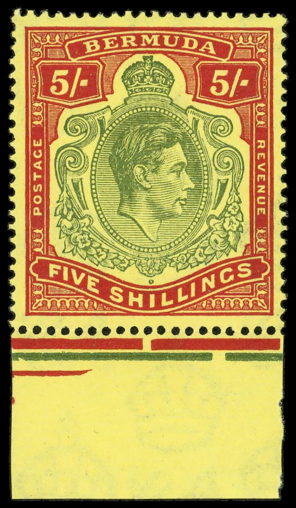 1945, King George VI, 5s green & red on pale yellow, perf 14, ordinary paper (Scott 125a), bottom margin single, o.g., never hinged, Very Fine. SG 118e. Scott $100. (Image)