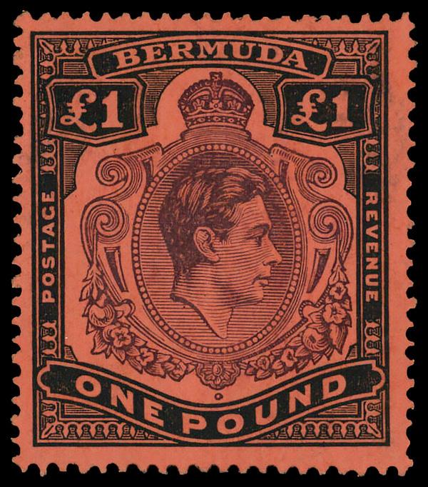1941, King George VI, £1 purple & black on red, perf. 14, "ER" joined (Scott 128b), o.g., very lightly hinged, Fine to Very Fine. SG 121a. Scott $88. (Image)