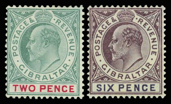 1904-1912, 2p green and carmine & 6p violet and purple Chalky Paper, King Edward VII (Scott 52a, 56b), singles, o.g., lightly hinged, Fine to Very Fine. Scott $45. (Image)