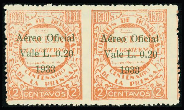 1933, Title Page of Government Gazette, First Issue, 2c orange overprinted (Scott CO15 var), horizontal pair imperf between, o.g., never hinged, Fine to Very Fine. Sanabria 118d; $100. (Image)