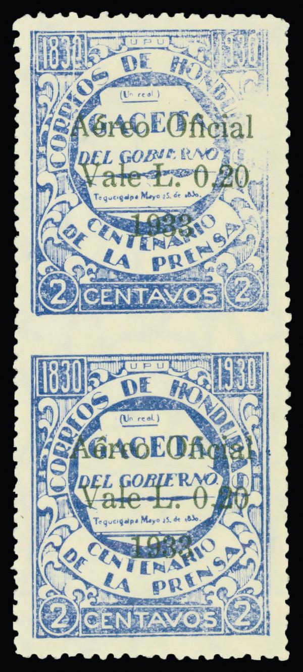 1933, Title Page of Government Gazette, First Issue, 2c blue overprinted (Scott CO16 var), vertical pair imperf between, o.g., never hinged, Fine to Very Fine, signed Aguilera. Sanabria 121e; $88. (Image)