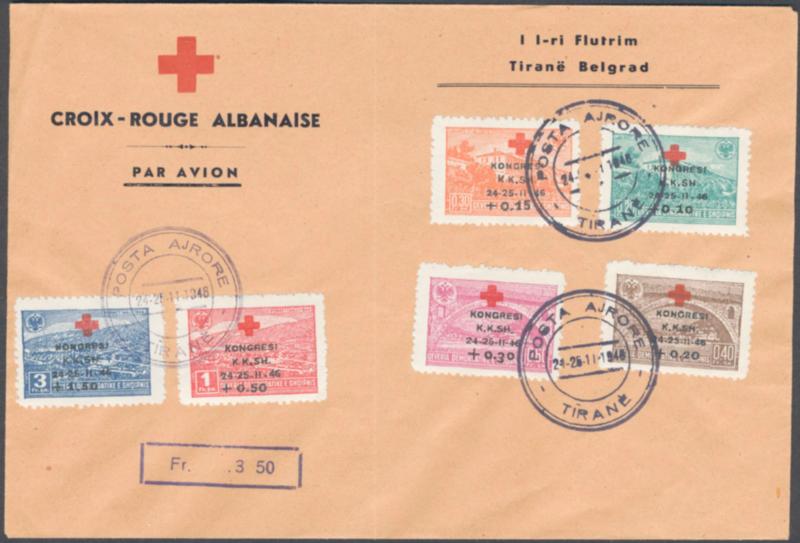 Alawitia, Michel 385-90 cover, Red cross set on unadressed, first flight cover Tiran-Belgrade. (Image1)