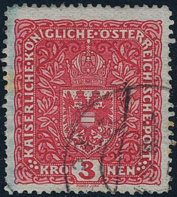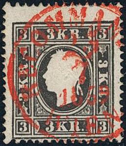 Austria, Michel 11 II used, 1859 King Franz Joseph 3 Kr black type II. Red cancellation. Good – fair centering. EUR 350 (Image1)