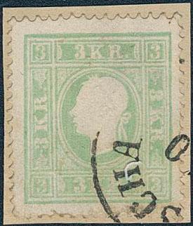Austria, Michel 12 II used, 1859 King Franz Joseph 3 Kr green type II. On piece. EUR 180 (Image1)