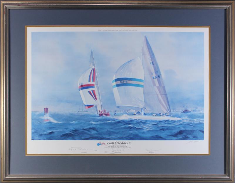 Australia II print 'Australia II Defeating Liberty (USA) in the final race for the 1983 America's Cup' signed by Hugh Treharne (Tactician), John Bertrand (helmsman), Ben Lexcen (Designer) & John Goble (artist), window mounted (no glass), overall 98x77cm; plus 'America's Cup 1983 - Australia II crossing the finishing line' by Ian Hansen (signed), overall 82x67cm, mainly Fair/Fine.
