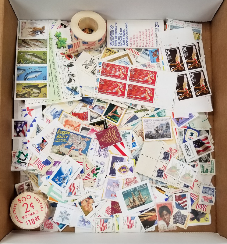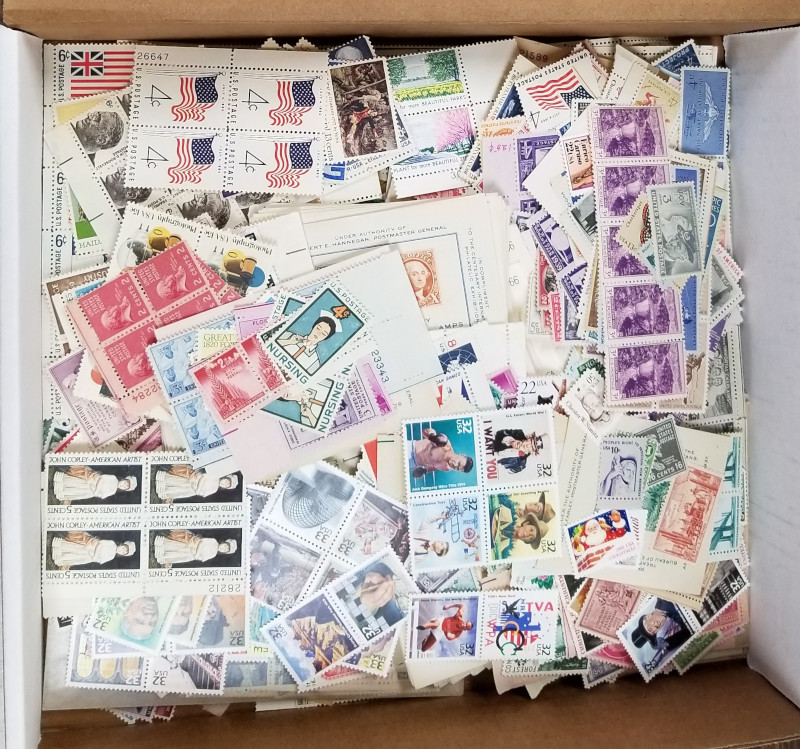 221 og imageBOX LOT #5 (2.lbs.) Contains Over 3,000 Unused Stamps, Mostly Dist. Gum, Hinged or No Gum, Some are "Stuck-Down", Not Sorted, Many Diff. Values (1 c. to $2.00), All are Good for Postage, Total Face Value is Over $580.00 (Image) (image2) (All Images)