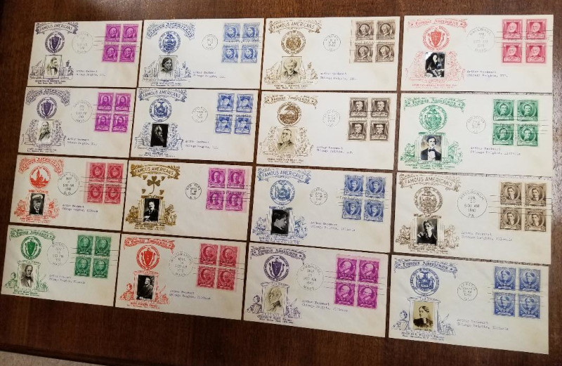 228 c image859-893 (35), "Famous Americans", 1940 Issue, Cmpt. Set of 35 Diff. F.D.C.'s, All with "Crosby" Cachet, All with Blks. (4 Stamps Each), Sound Cond., VF, SCV is About $1,200.00 (Image) (image2) (All Images)