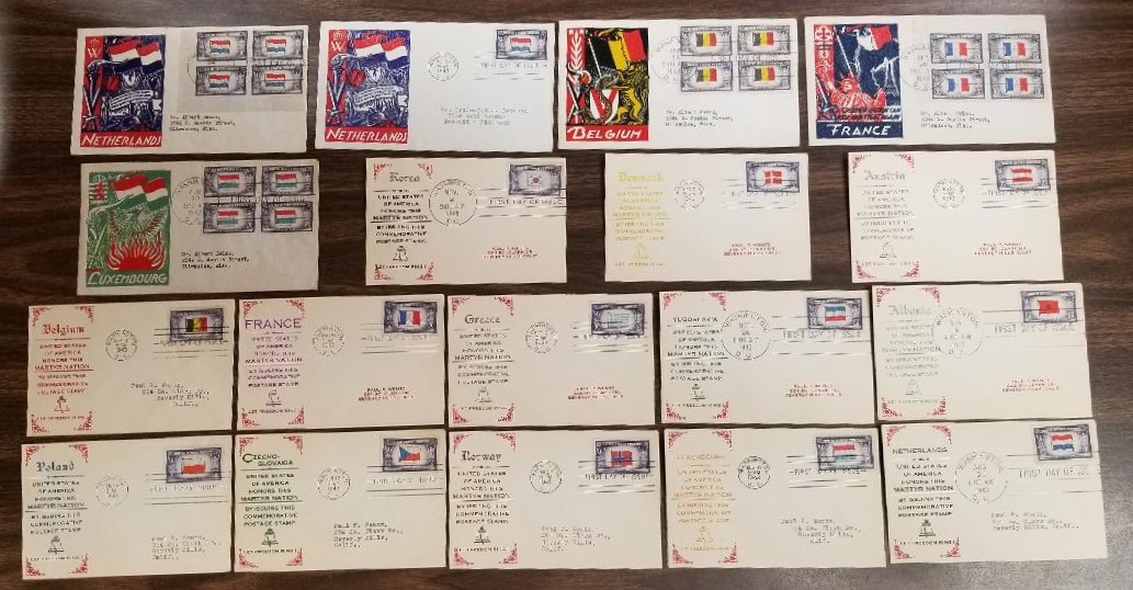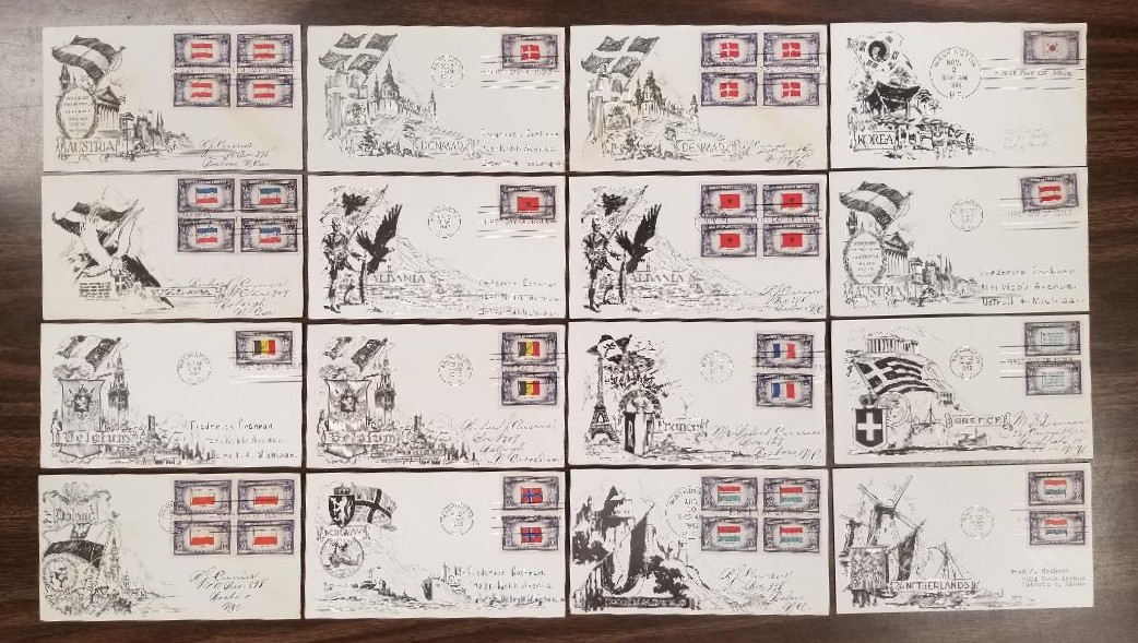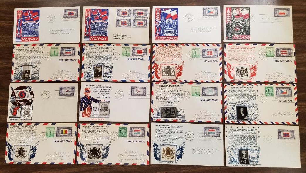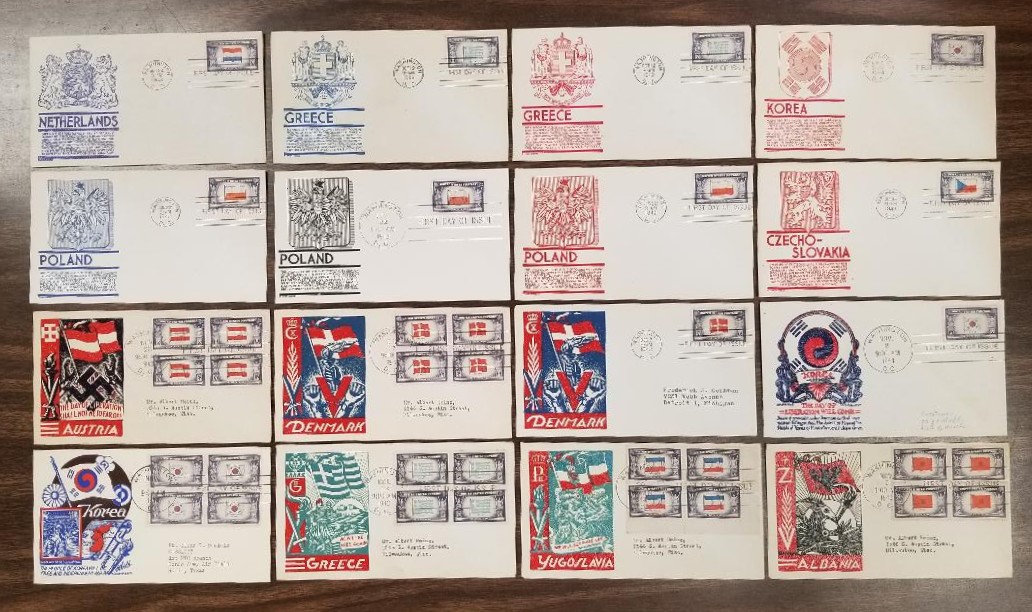 229 c image909-921 (13), "5 c. Overrun Countries", 1943-44 Issues, 107 Diff. Cacheted F.D.C.s, Many are Better Cachets, Includes 1st "SmartCraft" Cachet and 28 "Crosby" Cachets, Includes 21 Covers with Blks. of 4, Sound Cond., F-VF, SCV is About $1,000.00 (Image) (image2) (image3) (image4) (image5) (All Images)