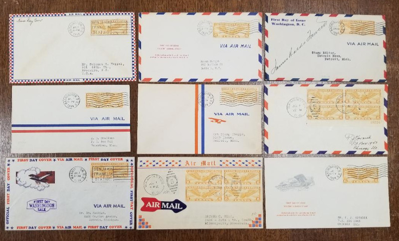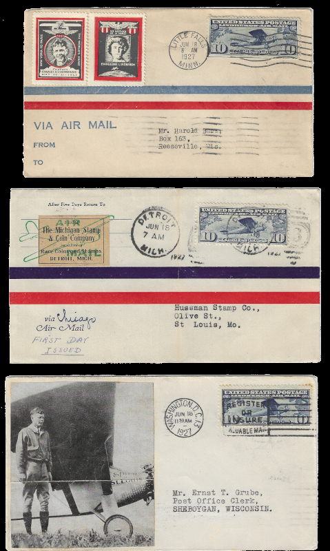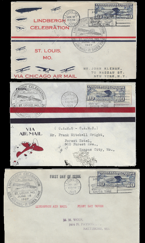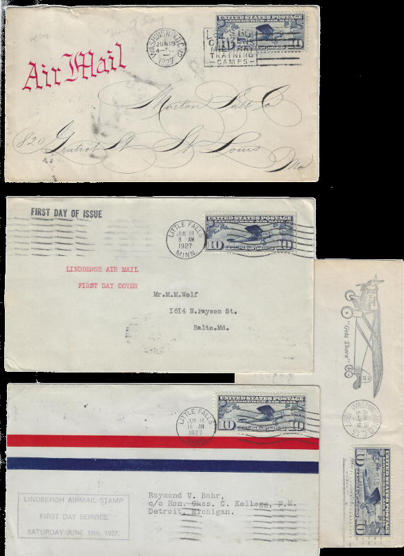 231 c imageC10 "10 c. Lindbergh", June 18, 1927 Issue, 10 Diff. Cacheted F.D.C.'s, Includes 4 Diff. City's , All have been Opened, Generally F-VF Cond., SCV is $1,250.00 (Image) (image2) (image3) (All Images)