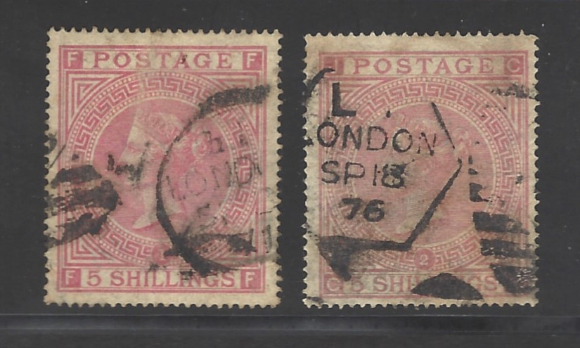 383 O image57 (P1, P2), "5 sh. Rose" (1867 Issue), Two Diff. Stamps, Used, Generally Sound Cond., F-VF, Margins Clear of the Design on All Four Sides, SCV is $2525.00 (Image) 2,525.00+