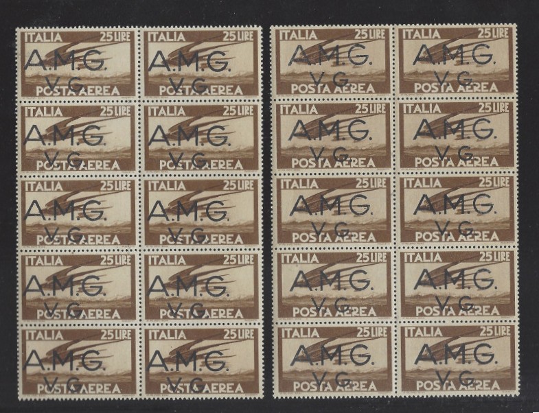 398 nh imageVENEZIA GIULIA, #1LNC6, 25 l. Brown (2 Blks. of 10), 1947 Issue, MNH, OG, Sound Cond., VF, SCV is $700.00 (Image) 700.00