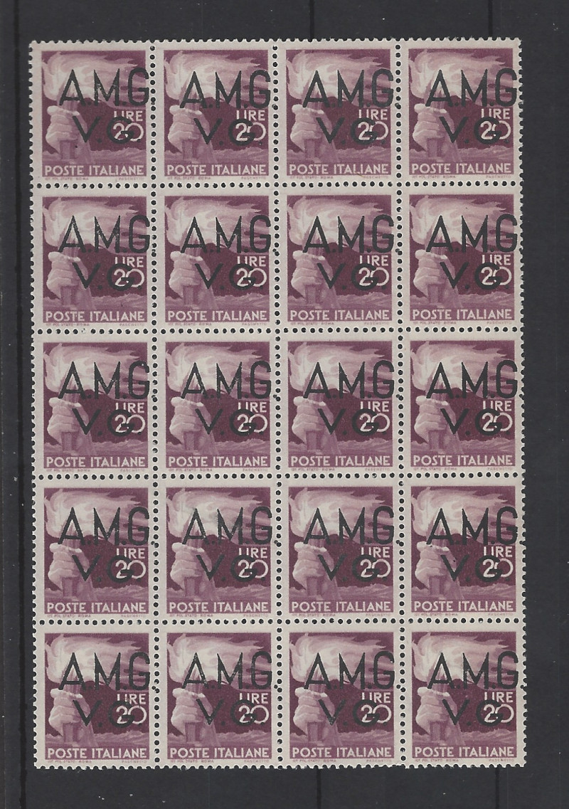 399 nh imageVENEZIA GIULIA, #1LN19, Mint Blk. of 20 Stamps, 1947 Key Value, Sound Cond., OG, MNH, VF, SCV is $1,100.00 (Image) 1,100.00