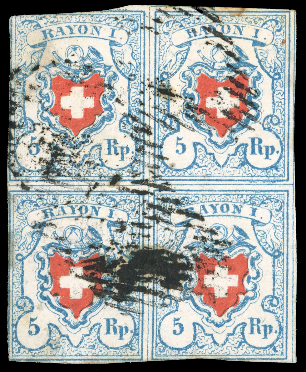 1851, Rayon I hellblau im Viererblock, Typen 14-15, 22-23, Stein C2-RU, farbfrisch, teilweise angeschnitten, leichte Bräunungen, rückseitig mit Gummi, entwertet mit schwarzer eidgenössischer Raute. Eine seltene Einheit. Attest APS 2006.