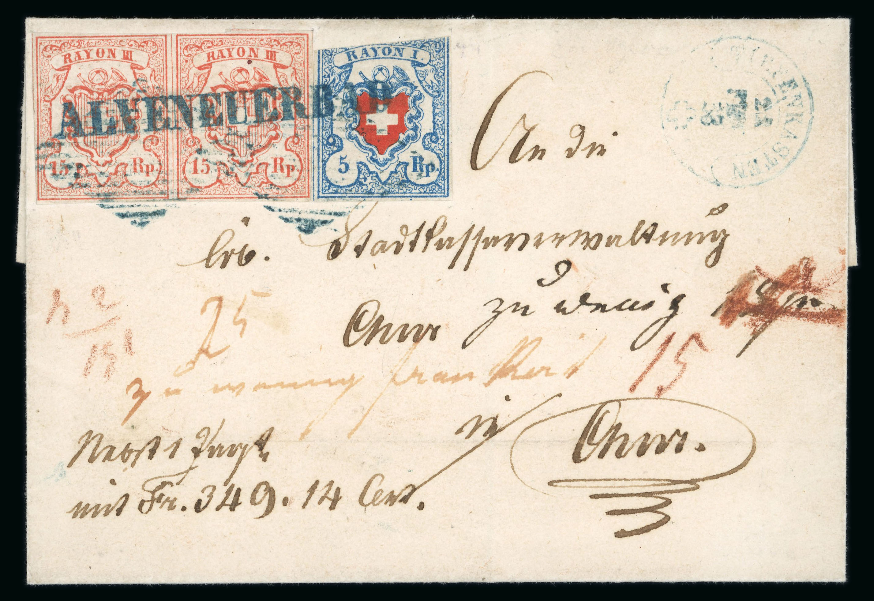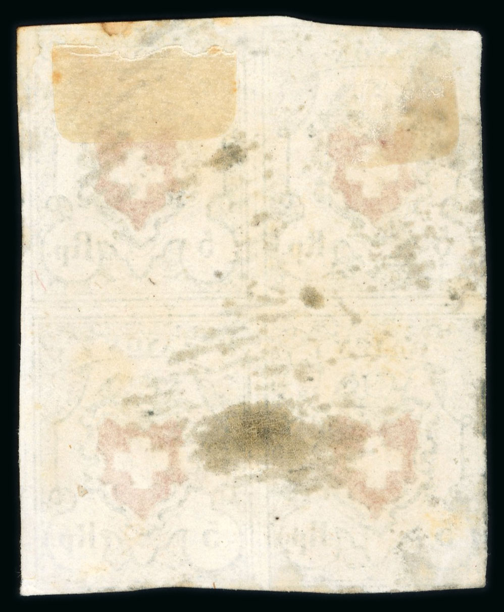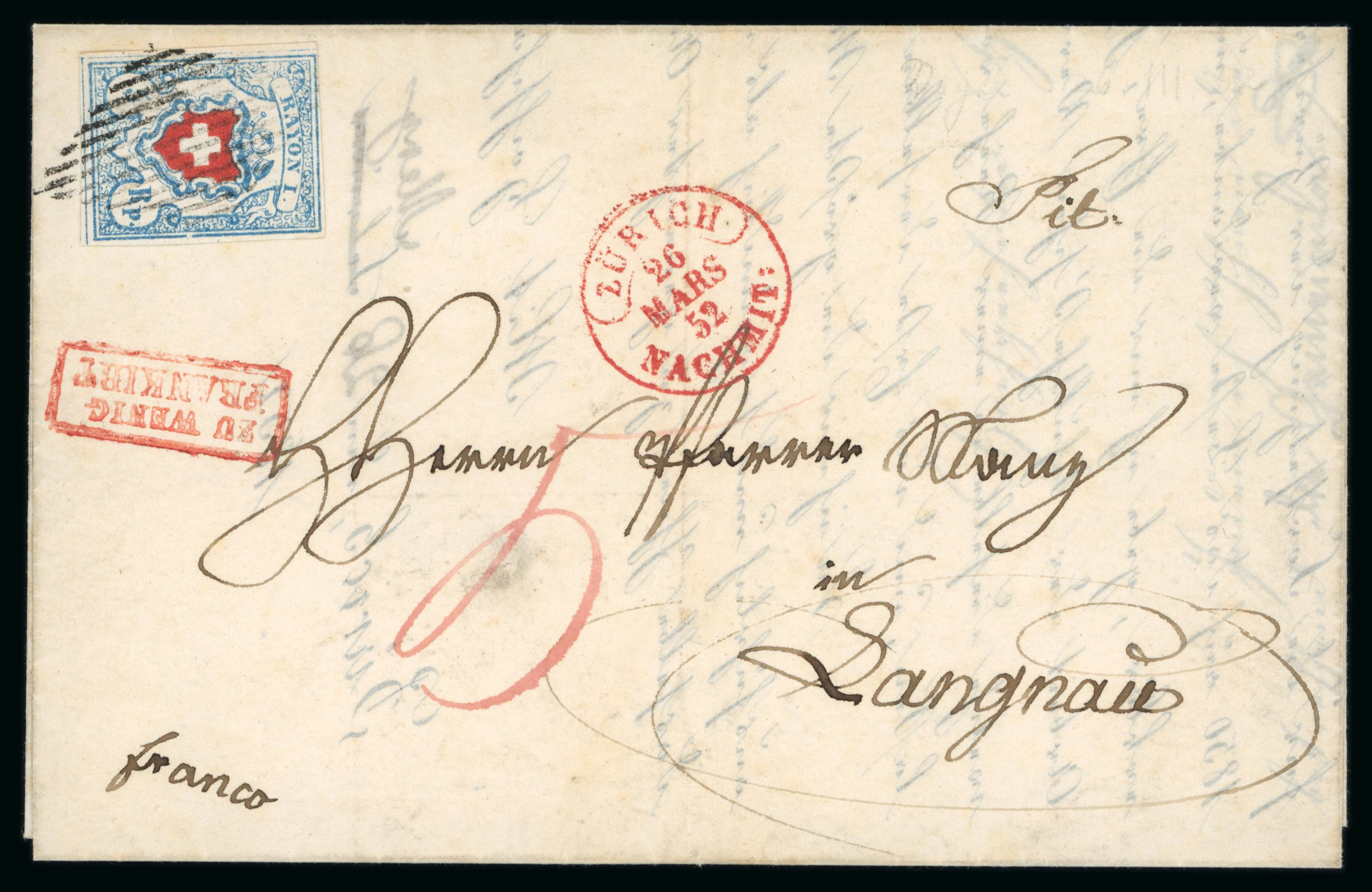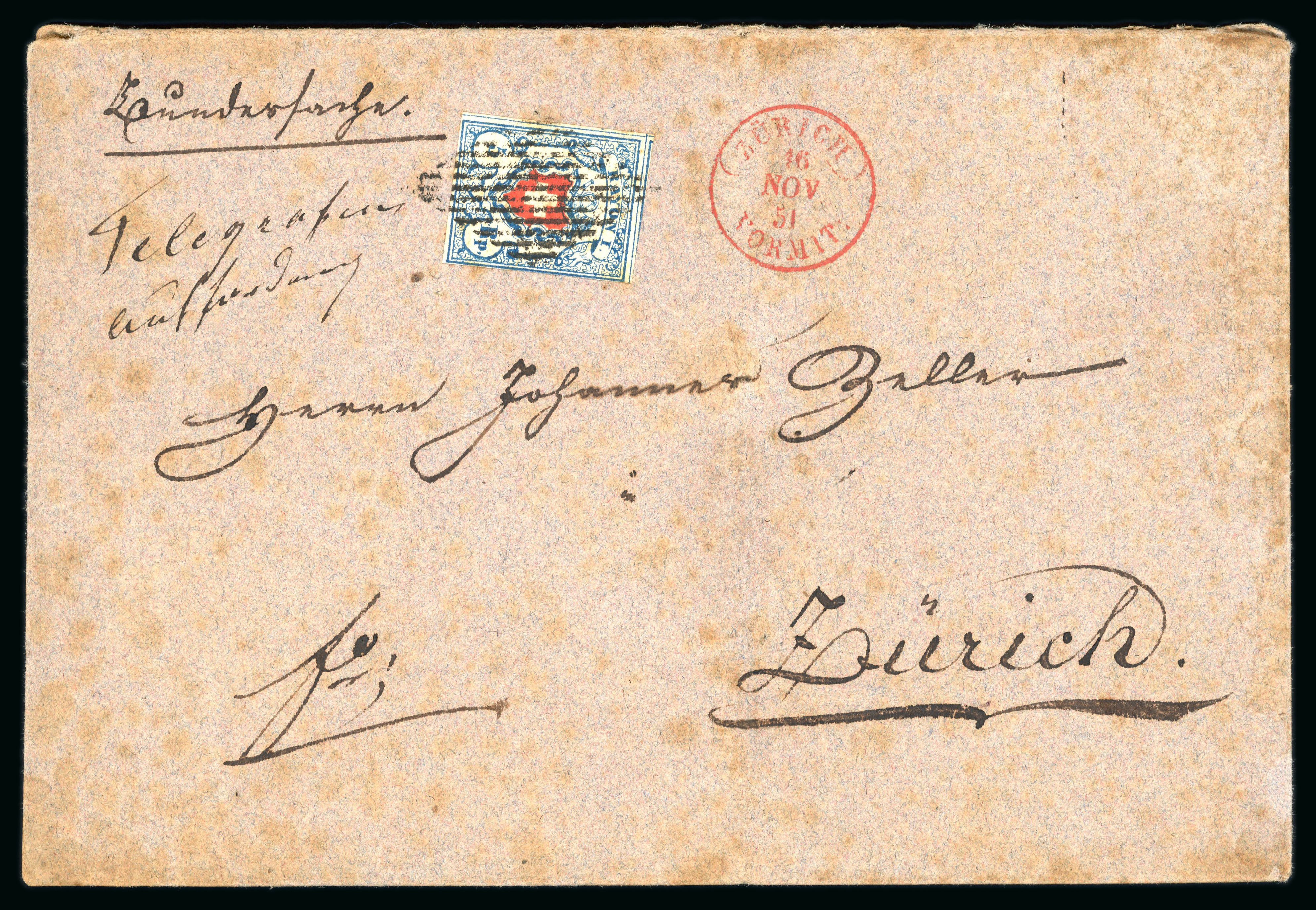 umadressiert, leicht und übergehend entwertet mit schwarzer eidgenössischer Raute und nebengesetzt « WINTERTHUR 6 MAI 54 », rückseitig Ankunftsstenpel Zürich. Schäfer bewertet solche Frankaturen mit CHF 1500. (Image 1)