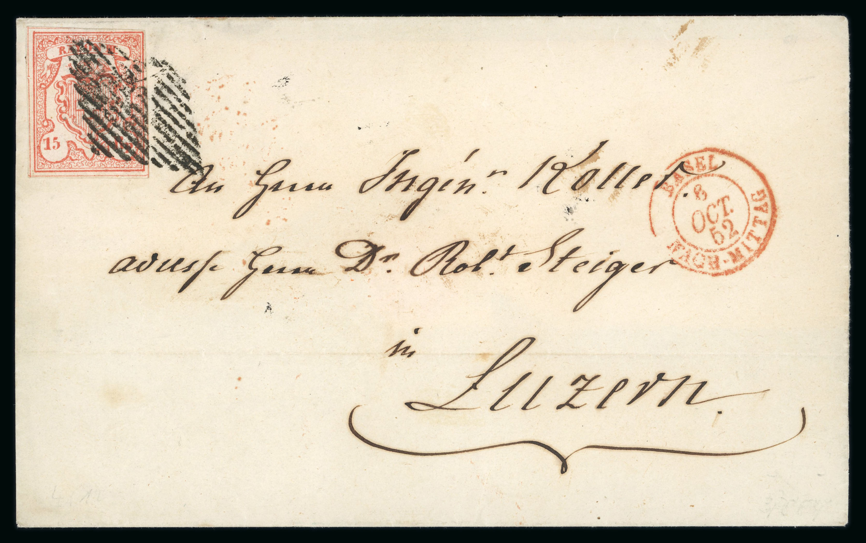 1852, Rayon III, kleine Wertziffern, Type 6, farbfrisch, allseits voll- bis breitrandig geschnitten, auf Faltbrief von Basel nach Luzern, übergehend entwertet mit schwarzer eidgenössischer Raute, nebengesetzt « BASEL 6 OCT. 52 NACH-MITTAG