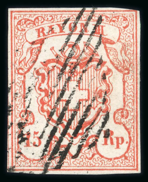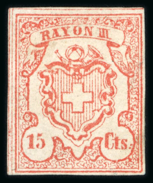 1852, Rayon III kleine Wertziffern Centimes, farbintensiv, allseits volle bis breite Ränder, leicht entwertet mit schwarzem Stabstempel « MUNSTER » (Kanton Bern, AW1572). Eine seltene Entwertung auf guter Marke. Atteste Hunziker 1972,
