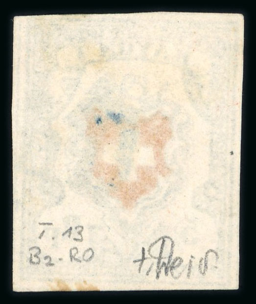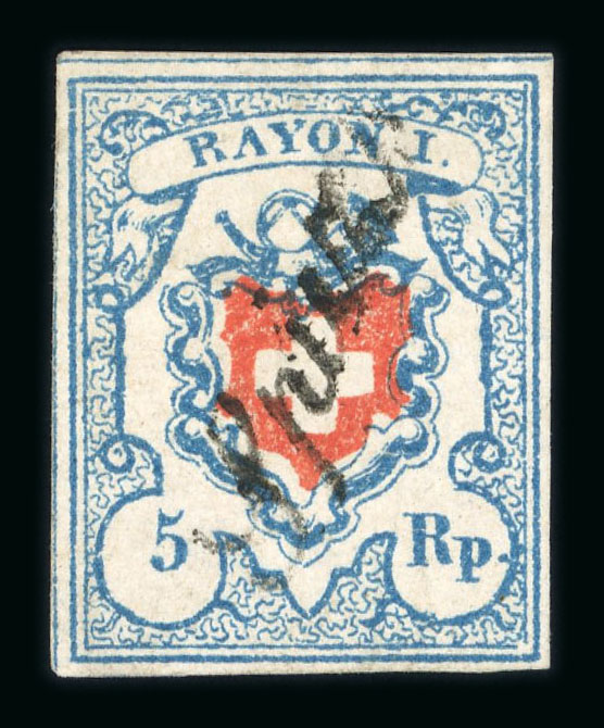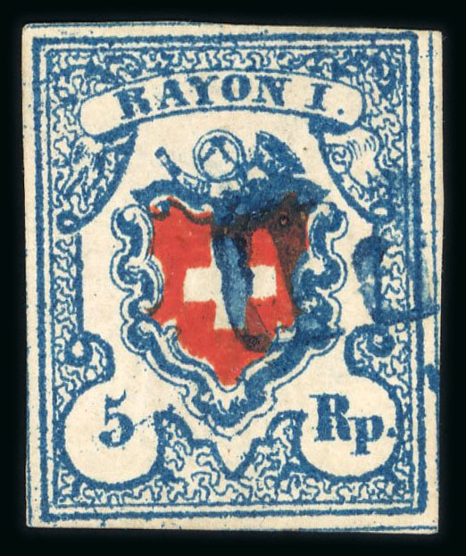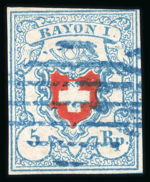 1851, Rayon I hellblau, Type 30, Stein U-RU, in frischer Farbe, allseits voll- bis breitrandig, kontrastreich entwertet mit blauer eidgenössischer Raute. Ein dekoratives Stück dieses seltenen Steins. Befund Eichele 2015. SBK = CHF 675. (Image 1)