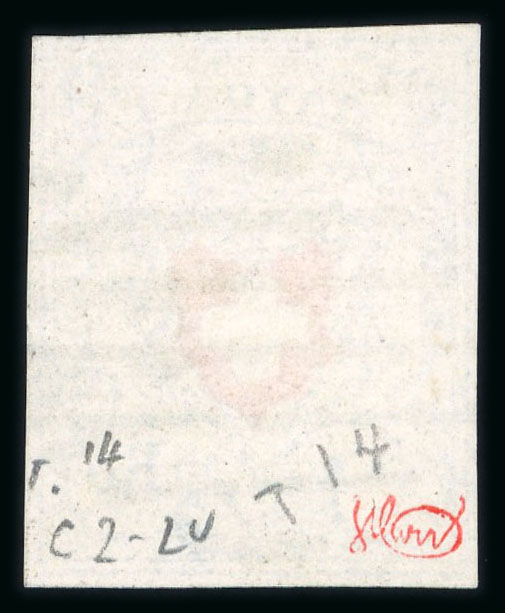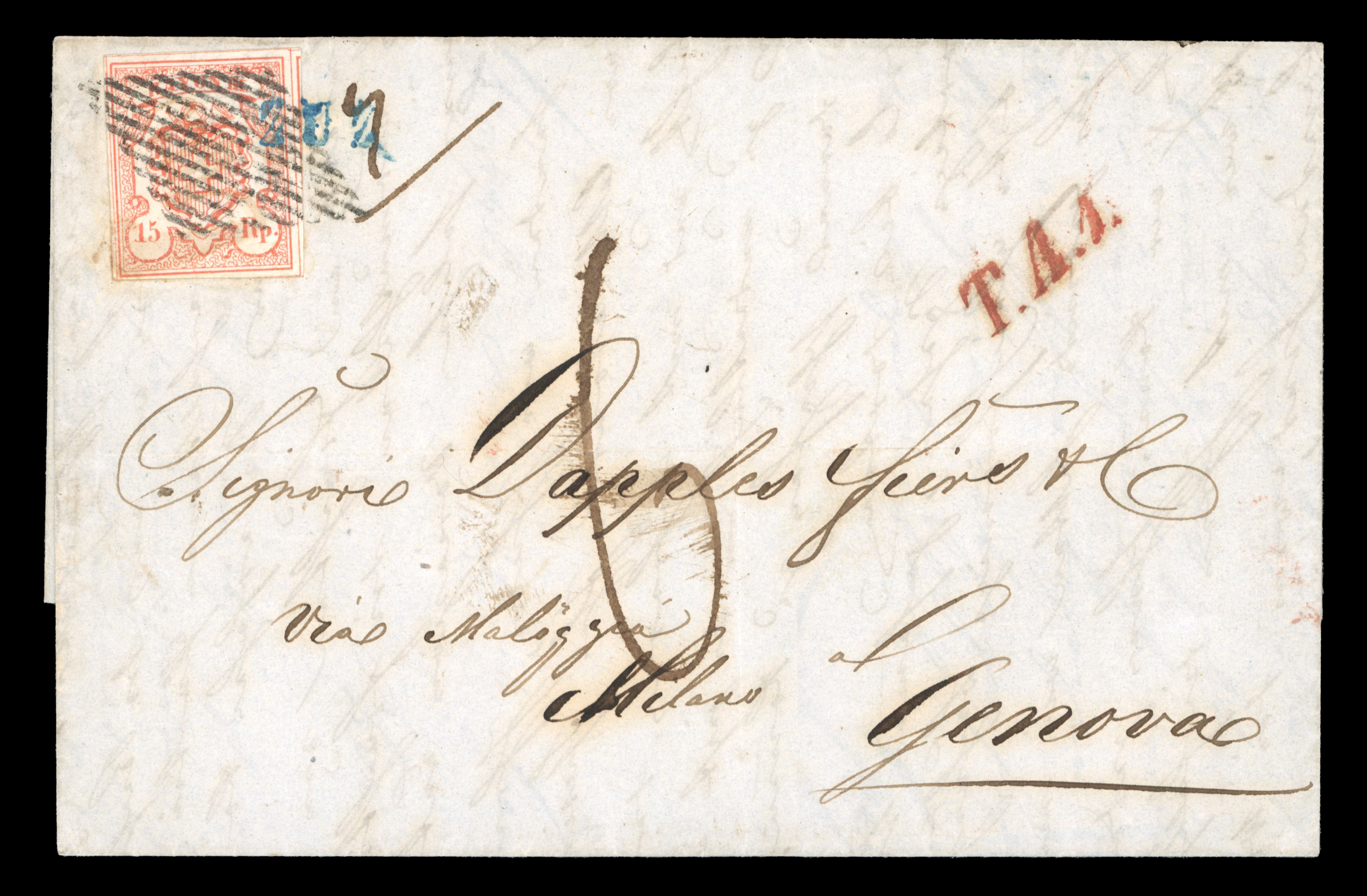 entwertet mit blauem Stabstempel « ZUZ », sowie nachträglich mit eidgenössischer Raute, nebengesetzt « T. A. 1 » (sardinischer Grenzpostamtstempel), rückseitig mit Ankunftsstempel Genova (Sardegna). 15 Rp. für einen einfachen Brief im 3. Briefkreis,