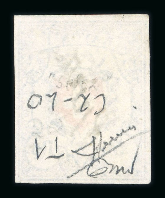 1851, Rayon I hellblau, Type 1, Stein C2-LO mit Plattenfehler « Spuren von Kreuzeinfassung », farbfrisch, allseits breitrandig geschnitten, zentrisch entwertet mit voll aufgesetztem Schreibschrift-Stabstempel Spiez. Ein sehr seltener